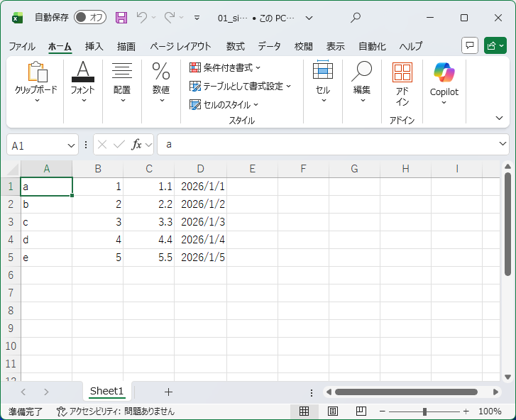 以下のような単純なExcelファイルを用意します。