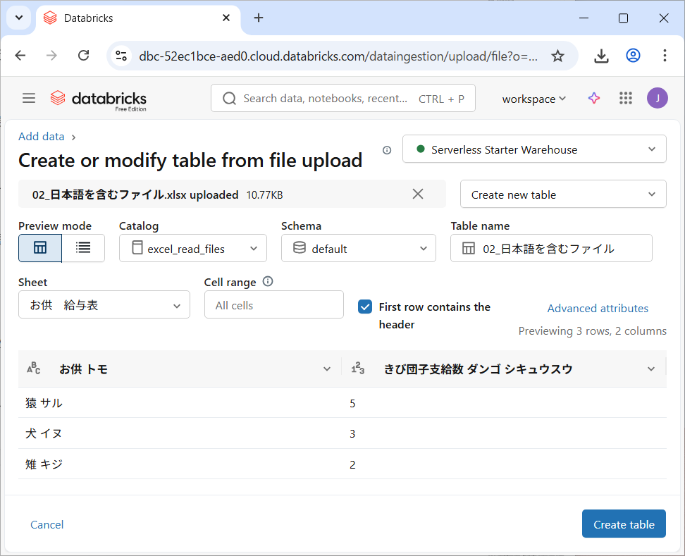 ファイルをドラッグアンドドロップでテーブルを作れる機能も内部的にread_files関数を使っているのか、現時点では同様に日本語のフリガナを拾ってしまいます。
